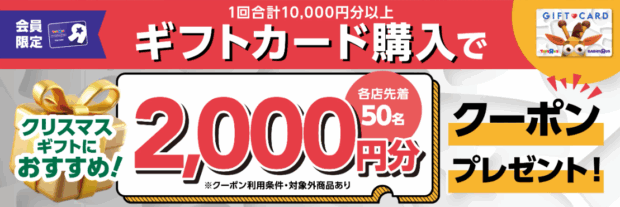 トップページ > ショップニュース > 1回合計10,000円以上ギフトカード購入で合計2,000円分クーポンプレゼント!