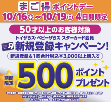 50歳以上のスターカード会員様限定、毎月第3日曜日は、トイザらス・ベビーザらス店舗およびオンラインストアにて¥3,000(税込)以上お買い上げで、対象商品が20倍ポイント還元になる『まご得ポイントデー』!