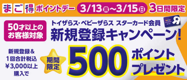 期間中に、トイザらス・ベビーザらススターカード会員に新規登録され、かつ期間中に1回合計税込¥3,000以上お買物された方に、期間限定500ポイントプレゼント