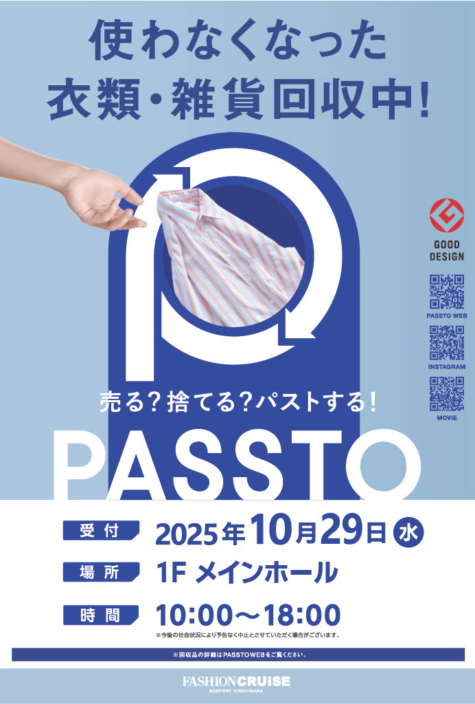 10/29(水) PASSTO in FASHION CRUISE 使わなくなった衣類・雑貨回収! PASSTO ■受付日時 10月29日(水) 10:00~