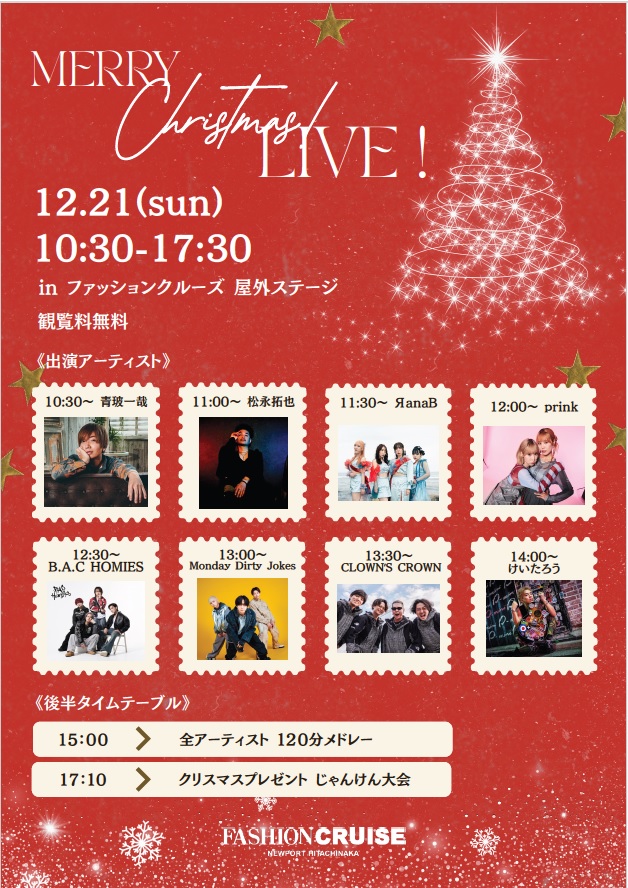 総勢8組による、クリスマスライブ! クリスマスプレゼントじゃんけん大会も開催します♪ 皆様のご参加をお待ちしております。